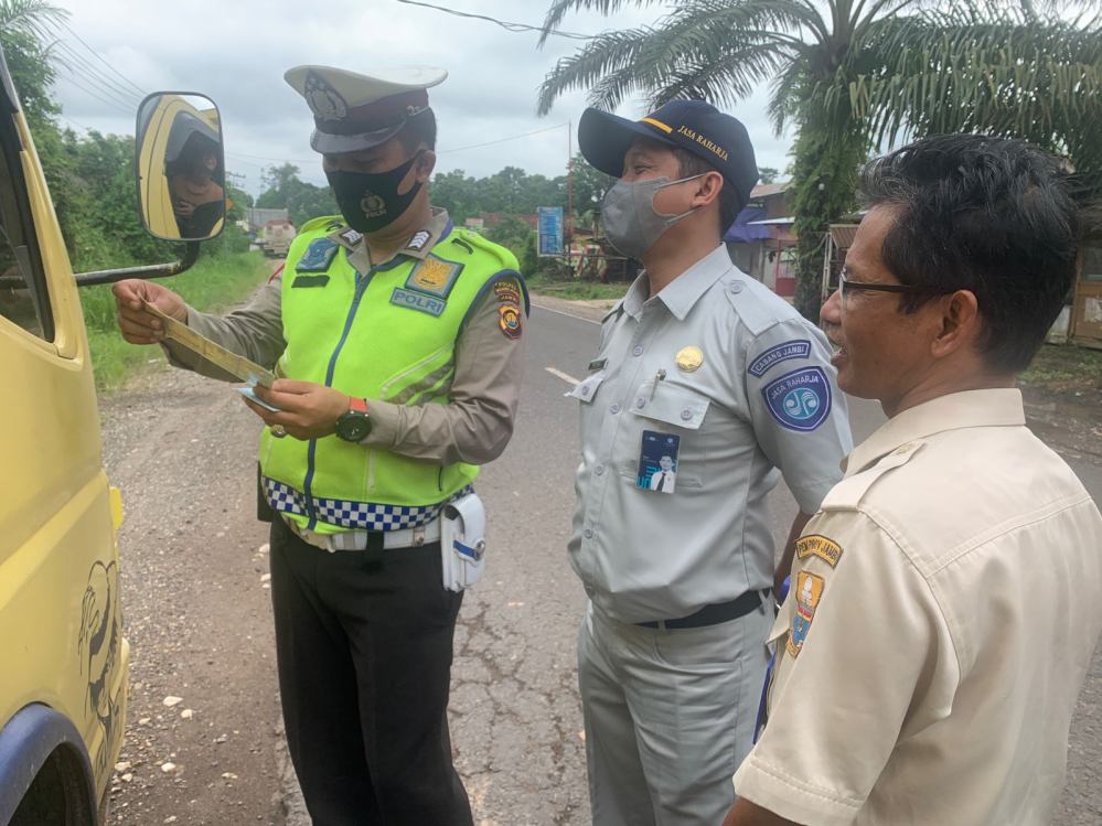 JAMBI- Jasa Raharja dan Tim Samsat Muaro Jambi gelar razia kendaraan bermotor himbau manfaatkan