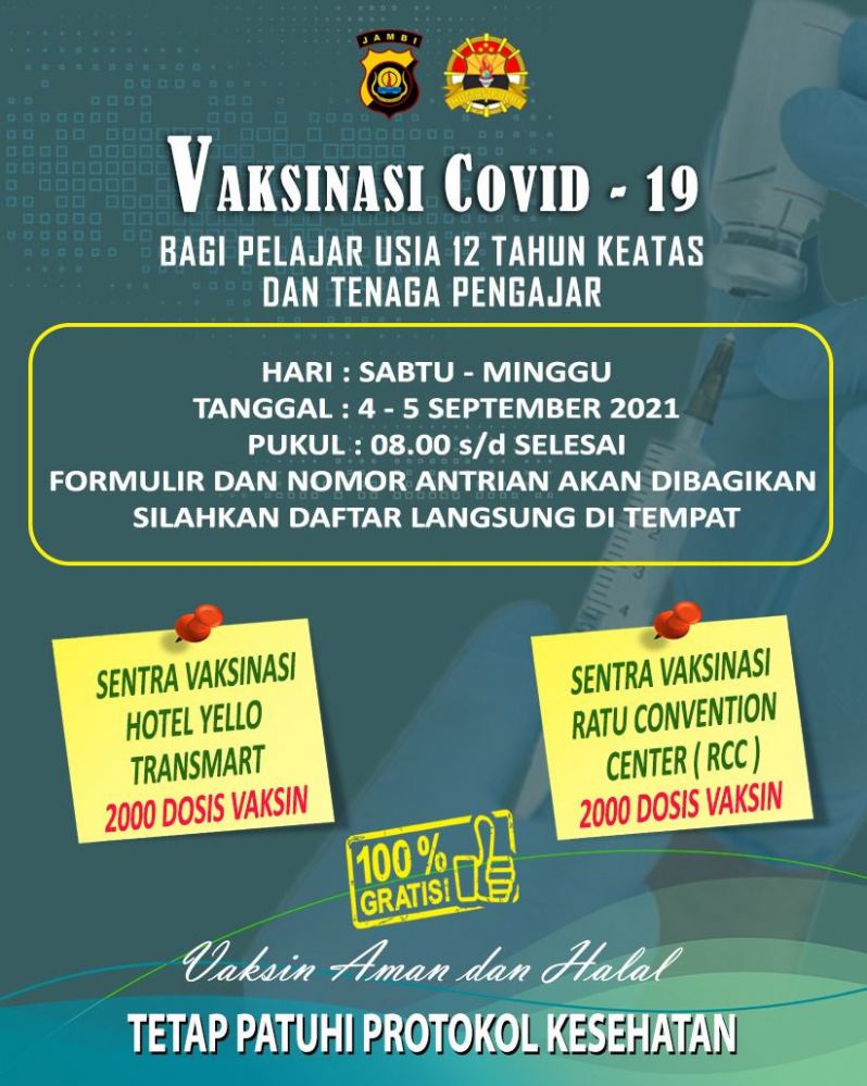 JAMBI - Kepolisian Daerah Jambi hari ini menggelar vaksinasi yang bertempat di Ratu Convention