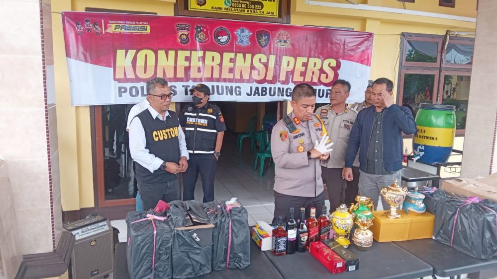 Tanjabtimur- Kepala Kepolisian Resor Tanjung Jabung Timur AKBP Andi Muhammad Ichsan Usman, SH, SIK Pimpin Konferensi Pers terkait tangkapan barang Ilegal berupa Miras dan Keramik dari Luar Negri Rabu 13 Juli 2022.