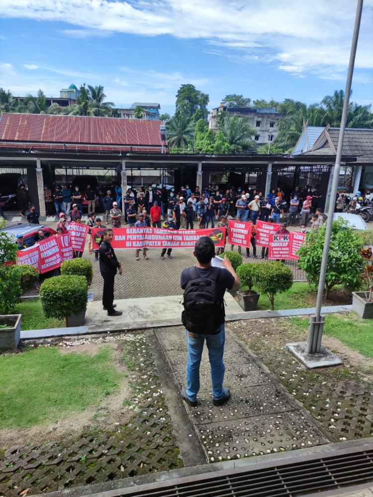 Kedatangan Masyarakat tersebut menuntut Dinas ESDM untuk menutup tambang yang ada di Kabupaten Tanjab Barat, yang mereka nilai merusak alam.